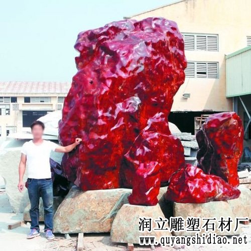这是一块高2.8米,长2米,宽1.5米,重达15吨的大红奇石,对就是一块货真价实的石头。其硬度已经达到7度,可以跟玉石相提并论了,而这块是大型的血红色大奇石就是我们石雕厂当初在内蒙古某个采石矿山上发现的,当初就是当地开采石料的时候发现裸露出的鲜红石头以后停止作业了,以为碰见这种石头不吉利,而中断了开采。当初我有幸路过此地,觉得新奇就去料山看了一下,当初肉眼就感觉到了商机,立马联系到了开山业主,在经过几天的讨价还价,以185万的价格得到了这块石头的开采权,经过工人的20天小心开采,这块大型的“鸡血红碧玉石”终于间的天日,与大家见面了。